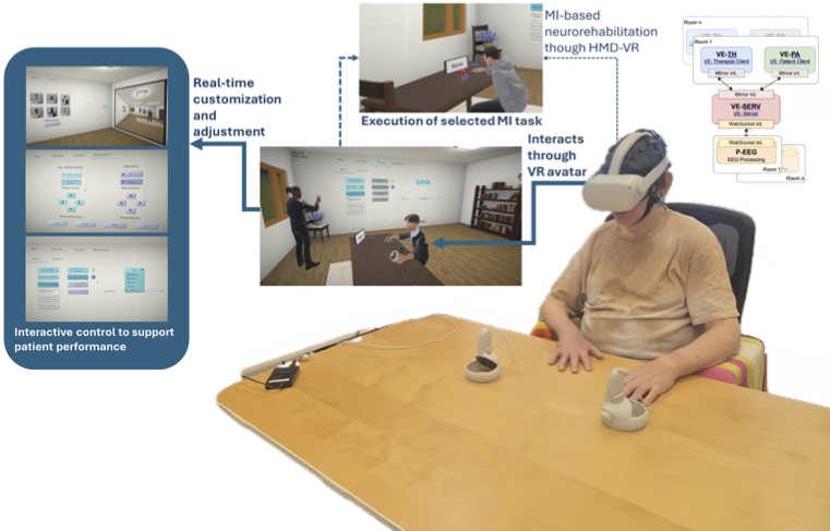 Integrated brain-computer interface (BCI) and virtual reality (VR) technologies provide a flexible platform for a series of neurorehabilitation therapies based on motor imagery in patients after stroke. However, these approaches lack the social aspect and human interaction. As part of our research, we successfully designed an intelligent BCI system in which the patient and therapist collaborate through their avatars within a VR environment. This system enables the creation and selection of various occupational therapy scenarios according to the patient’s recovery needs, mental state, and immediate responses [3]. Using machine learning methods – particularly neural networks, N-way partial least squares, and tensor decomposition – we also investigated the possibilities of monitoring mental fatigue levels during VR-based rehabilitation [1], EEG signal preprocessing [2, 5], and oscillatory EEG rhythms detection [4].