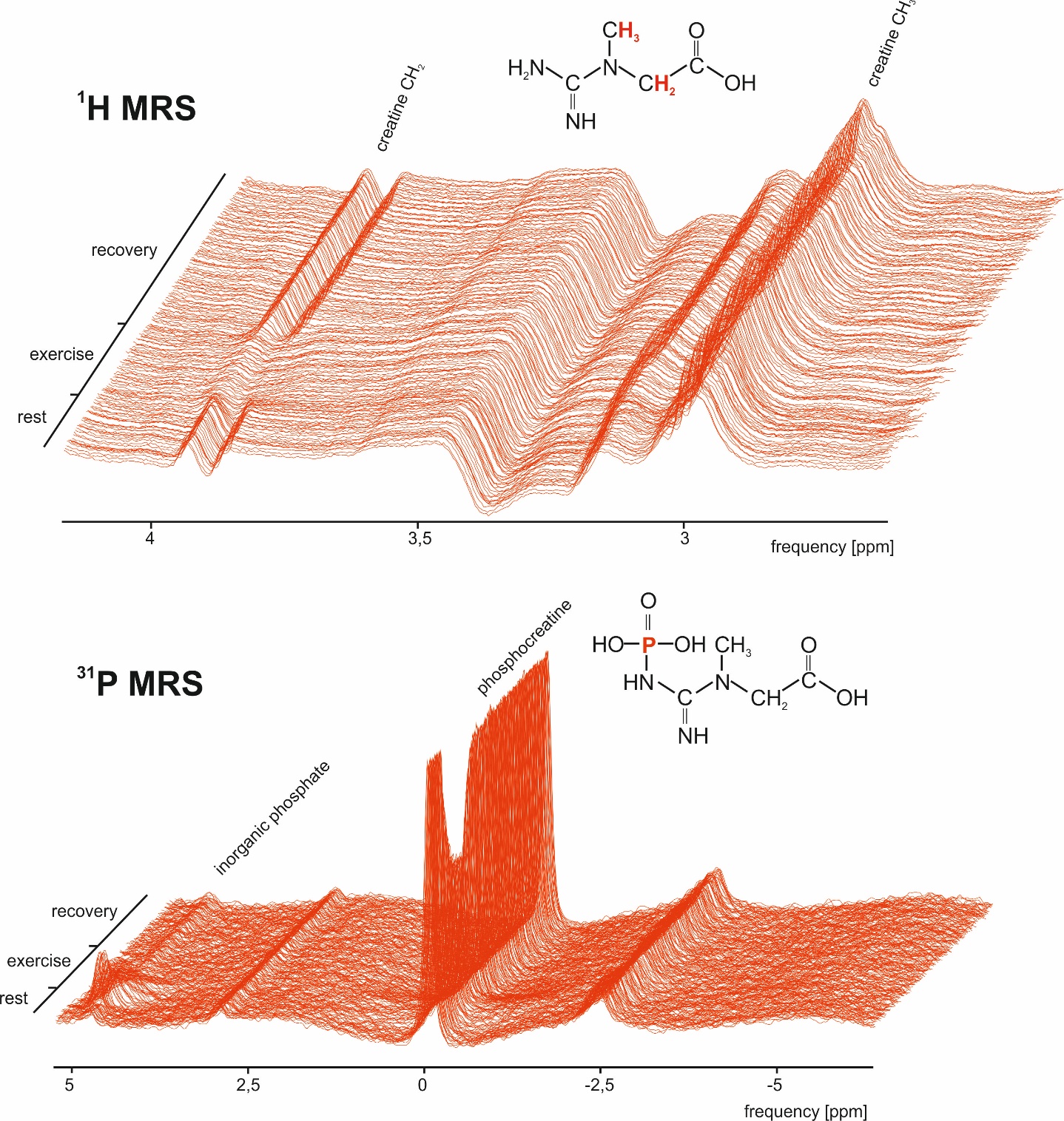 Obr. 1: Reprezentatívny časový priebeh spektier 1H (hore) a 31P (dole) získaných počas 3 minút v pokoji, 5 minút cvičenia plantárnej flexie a 10 minút regenerácie z lýtkového svalu jedného dobrovoľníka. V štruktúrnych vzorcoch (P)Cr sú zvýraznené protóny a fosfor, ktoré spôsobujú signál MRS.