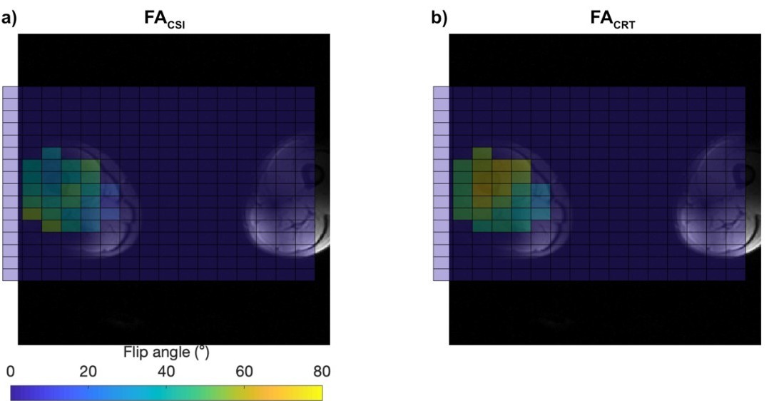 Obr. 1 Mapa excitačného uhla, nameraná pomocou štandardného pomalého vzorkovania sigálu (jeden rez za 13 minút) je na paneli a), a pomocou rýchleho vzorkovania kruhovou trjektóriou (3D objem za 5 minút) na paneli b).