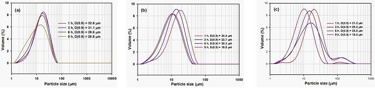 Distribúcia veľkosti sklených mikroguľôčok pripravených plameňovou syntézou a mletím pri rôznych podmienkach (a) priemer mlecích gulôčok 5 mm, rýchlosť otáčok 200 rpm – M1, (b) priemer mlecích gulôčok 11 mm, rýchlosť otáčok 350 rpm – M2, (c) priemer mlecích gulôčok 20mm, rýchlosť otáčok 350 rpm – M3